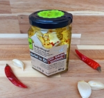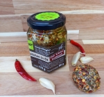 Zutaten: Frischkäse (Milch, Käsereikulturen), Sonnenblumenöl, Chili, Kräuter (Rosmarin, Thymian, Bohnenkraut, Basilikum, Estragon), Salz, Knoblauch