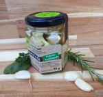 Zutaten: Frischkäse (Milch, Käsereikulturen), Sonnenblumenöl, Kräuter (Rosmarin, Thymian, Bohnenkraut, Basilikum, Estragon), Salz, Knoblauch